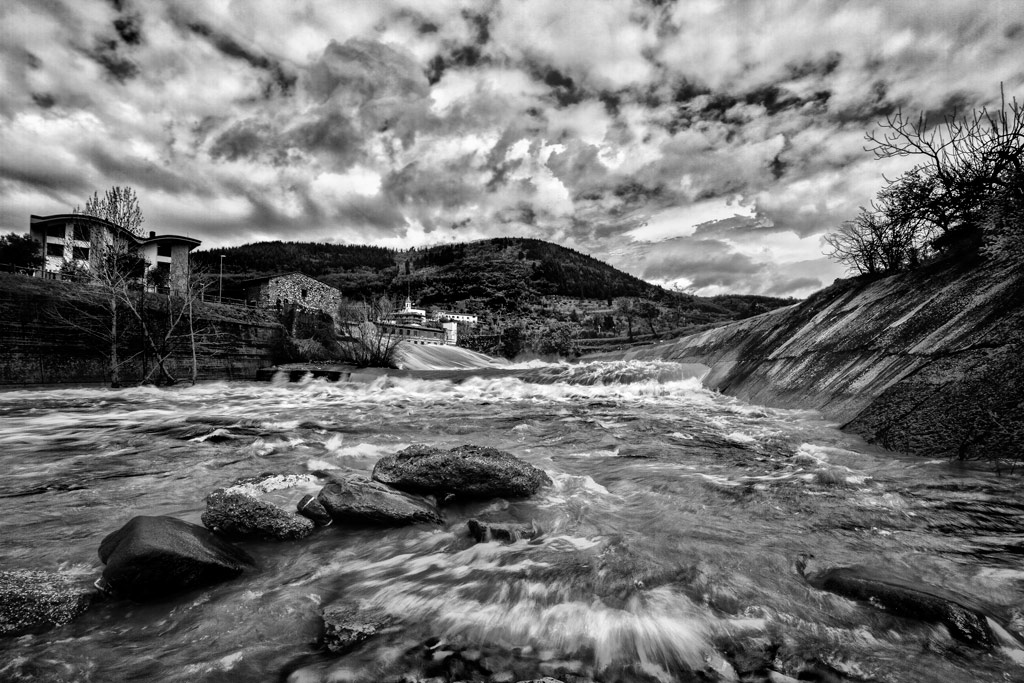 mi piace il punto di ripresa, che ben si accosta alla conversione in B/N e al cielo per esaltare l'idea dell'impetuosità del fiume...
