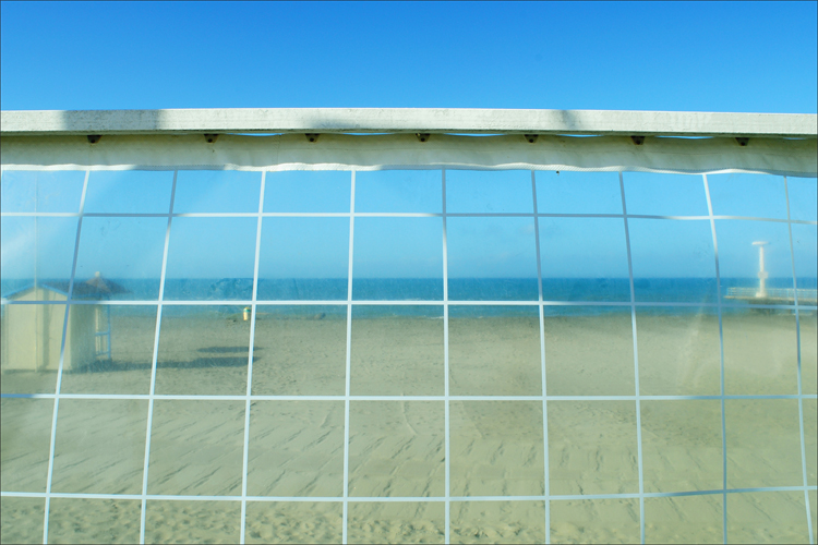 Hai un modo personalissimo di "vedere" il paesaggio, sempre "contaminato" da un dettaglio, da un particolare di derivazione umana. E anche qui tu soffermi sul mare visto dietro ad un telone che lo opacizza. E' una visione del paesaggio molto diversa dai canoni "tradizionali" e per questo motivo apprezzabile.
