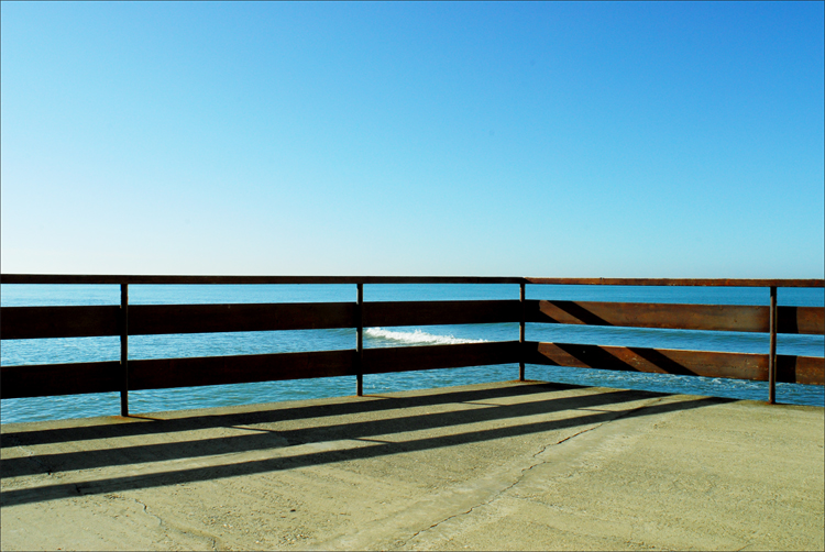 L'ombra della ringhiera, la schiuma bianca dell'onda e l'orizzonte evidenziato dal corrimano. |