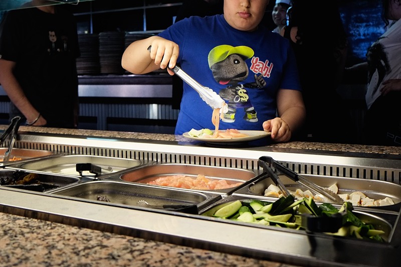 Divertente e ben tagliata: non occorre tutto il viso per raccontare l'appetito: c'è la mano che riempie, la maglietta che apprezza e la leggera pinguedine che testimonia un'abitudine.