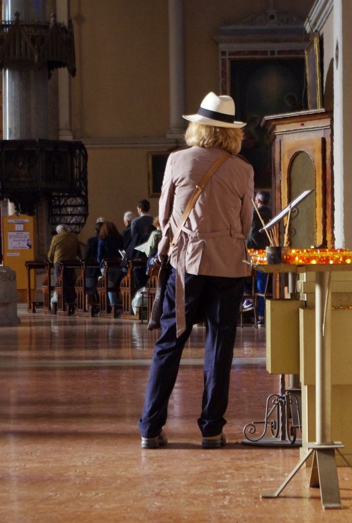 Rispetto a chi ha scattato, i dati che chi guarda può ritrovare nella foto sono minori: non c'è un fuori chiassoso da opporre. Qui si vede una donna di schiena, dal cappello direi una turista, all'interno di una chiesa di cui si vede il pulpito tagliato, qualche banco e le candele accese. La donna è staccata dal gruppo di fedeli sullo sfondo: da qui la sensazione che sia di passaggio.