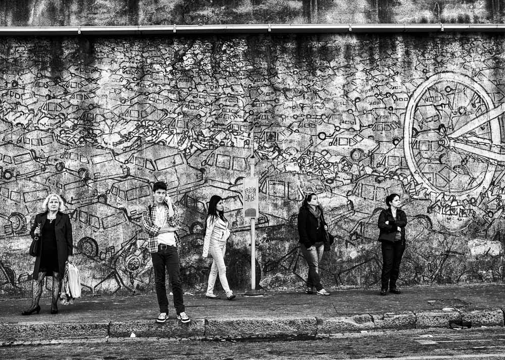 Bella foto, mi piace molto, interessantissimo il muro e ben posizionati i cinque in attesa.