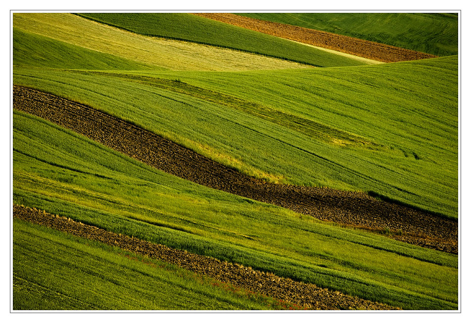Un verde morbido e vellutato interrotto dalle strisce di terra arata, si distende su tutto il frame. La luce l'accarezza senza forti contrasti evidenziando le bellissime sfumature. Molto bella. Complimenti Nico.