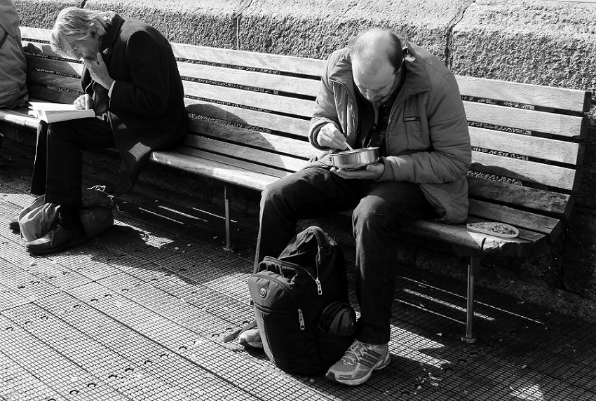 Due soggetti messi a confronto attraverso richiami ed antitesi: pose simili, entrambi chini, con le borse poggiate a terra tra le gambe; c'è poi questo contrasto nell'aspetto, nei capelli (lunghi nel primo, mentre il secondo a destra rasente la calvizia) e nell'abbigliamento ( tenuta classica, mentre l'altro è più casual)