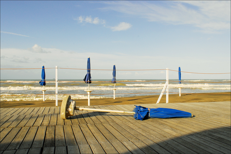 | Clara Ravaglia ha scritto: | Una delle meno commentate della tua lunga serie di omaggi agli ombrelloni chiusi sula spiaggia disabitata. Eppure a me piace tanto quanto le altre se non di più. Esteticamente la doppia corda ben visibile orizzontalmente toglie un po' di pulizia alla scena, eppure concettualmente è molto importante. Grazie alle doppie corde l'ombrellone in pp pare davvero un pugile messo ko, da un nemico invisibile, non contrastabile, esattamente come la forza del vento.