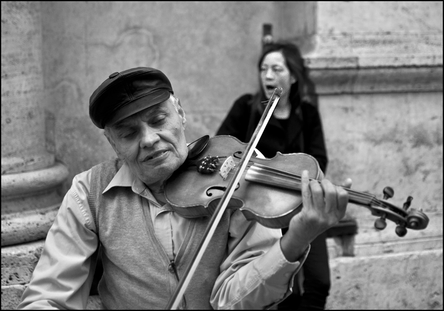 -se lo scopo dello scatto era invece quello di unire un buon ritratto di strada (del violinista frequentatore assiduo di via del corso Smile ) alla componente simpatica data dallo sbadiglio delle donna, allora avrei tentato di evitare la sovrapposizione con l'archetto.