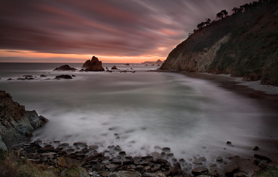 Immagine connotata da gradevolissimi colori, ben composta ed efficacemente giocata sul grafismo di quelle nuvole "in movimento". Ove possibile avrei allargato leggermente il campo al fine di riprendere per intero la curva dell'insenatura alla dx del frame.