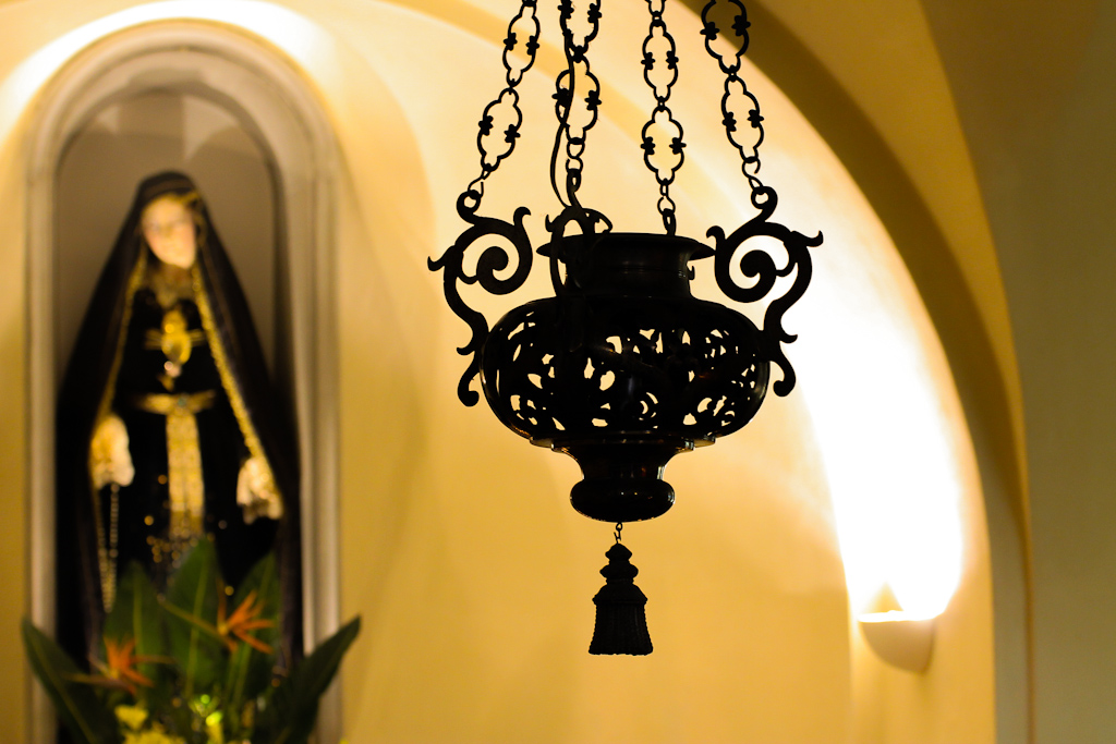 l'inquadratura è stretta..sacrificata..hai tagliato l'arco che avrebbe dato slancio, e la luce è completamente sbagliata..hai una lampada a muro sulla dx che è sovraesposta ma la lampada in primo piano è sottoesposta e con la catena tagliata..la madonnina poi è fuori fuoco..l'occhio dove dovrebbe cadere?