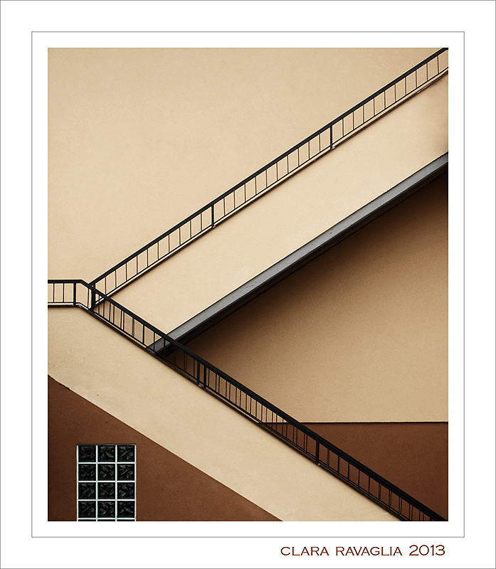 Che bella Clara! Gradevolissima composizione e impianto cromatico davvero accattivante per la sua eleganza...ma quanto arricchisce quell'ombra, sotto la rampa che sale, che sfuma verso il colore della zoccolatura. Ottima. Complimenti.