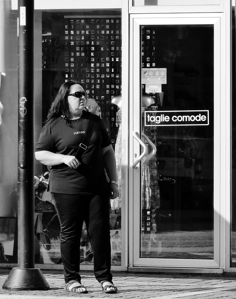 Sai perché secondo me non regge? Perché è "cattiva", la street non è cattiva, la street porta al sorriso non alla presa in giro e questa immagine, sono sicuro malgrado la tua volontà, finisce per essere una presa in giro, seppur garbata, della signora e non può trasmettere quel sorriso, o quella riflessione, tipici della fotografia di street.