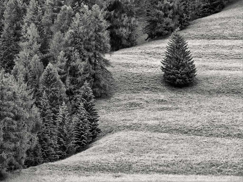 Susanna mi piacerebbe vederla colori, queste conifere miste che confinano con il pascolo, con questo taglio che trovo interessante con il bn si perdono un poco. Mia opinione naturalmente.