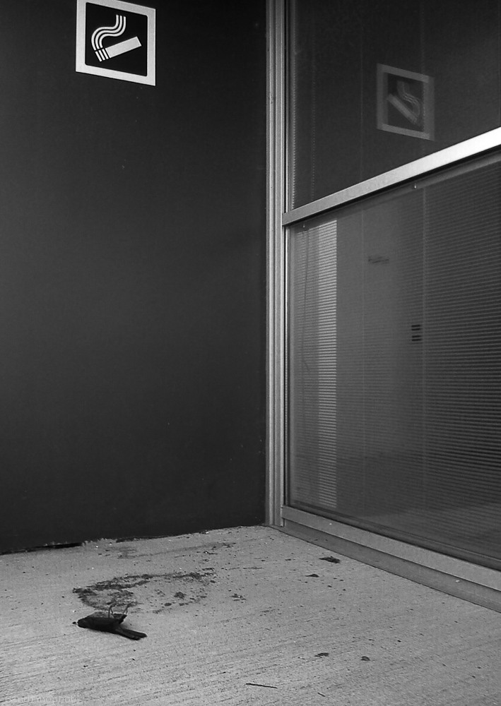 | Perdonami Sandrino ma, almeno a me, non arriva alcun messaggio, il volatile è di difficile lettura, occorre un po' di tempo per decifrarlo, mi pare troppo scuro e troppo poco definito, e sovrastato, a livello sia fisico che percettivo, dalla macchia di sporco in terra; ciò che attira molto l'occhio è il segnale, che comunque, a mio avviso andrebbe riportato sul bianco, è attirando l'occhio non si può non notare il taglio del suo angolo. |