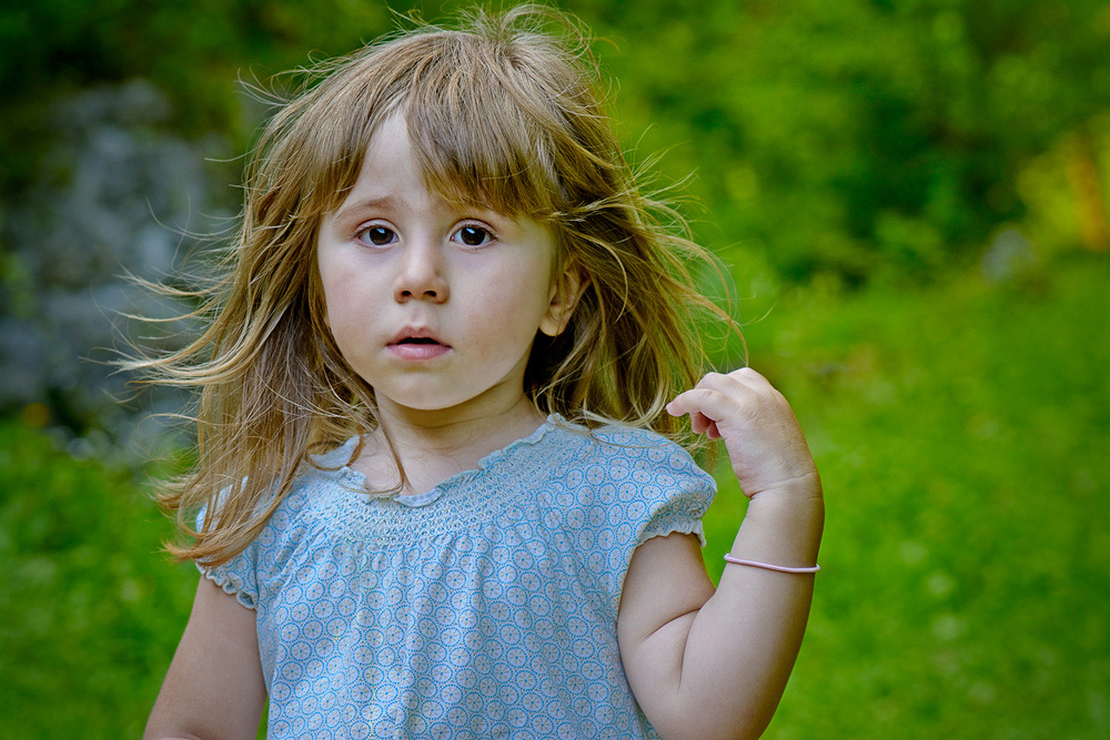Particolarissima l'espressione della bambina, e interessante lo sfocato, forse avrei evitato di tirare su le ombre.