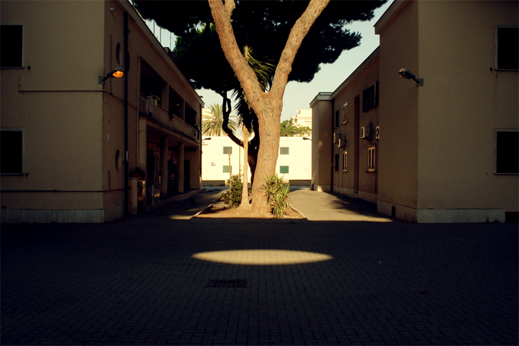 Mi piace la 'quasi' specularità della foto, sorretta dalla fila di alberi e dalla luce che penetra in maniera quasi prepotente fra i due blocchi di case: una foto molto 'geometrica' per la suddivisione dei volumi, con una ellisse di luce introduttiva che trovo molto azzeccata. Il primo albero però è ridotto quasi ad una fionda...forse un cm meno sotto e in più sopra?