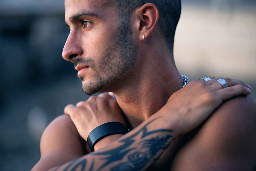 Speciale la luce, il gioco di lievi chiaroscuri sull'incarnato e il valore aggiunto di quel piacevole bicromatismo bianco-azzurro dello sfondo, che, a suo modo, gioca in armonia con il blu del tatuaggio e la chiarezza degli anelli.