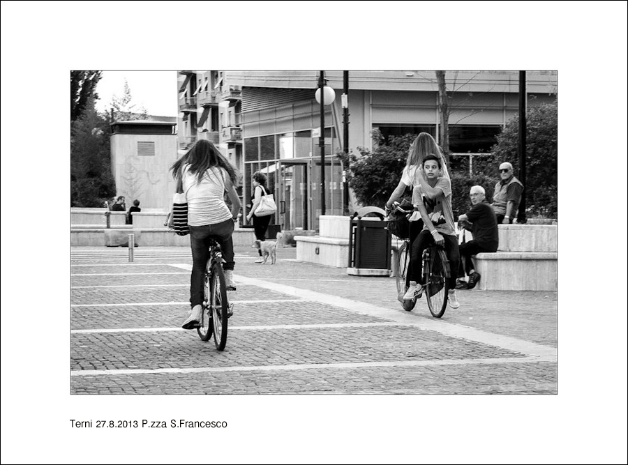 Molto bella. Gli sguardi del ragazzo in bicicletta e delle persone anziane sedute ai lati della strada portano inesorabilmente alla ragazza che procede da sola sulla sinistra. Pur trovandosi in posizione privilegiata nella foto, lo sguardo va prima ai visi e poi a lei che è posta di spalle.