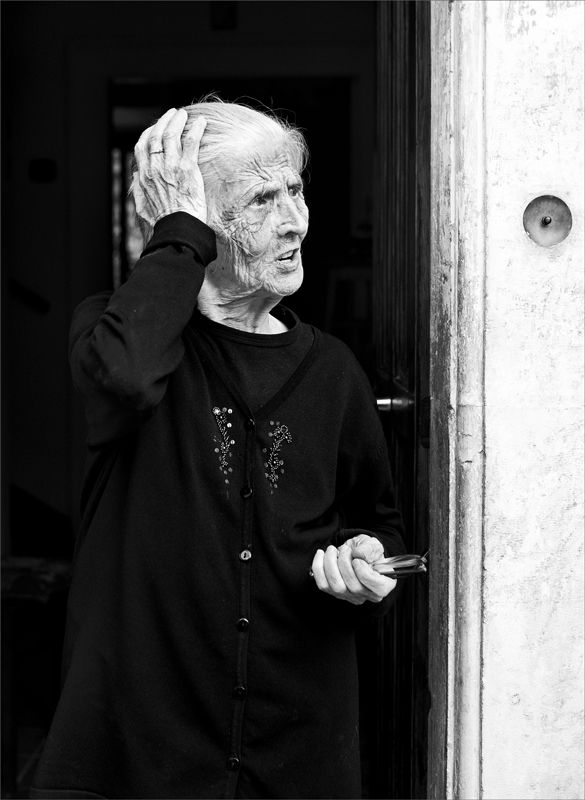 In questo caso, più stretto, avrei preferito uno sguardo in camera, perchè quel guardare in là è disturbato (sempre secondo me) dal campanello.