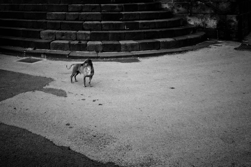In questa foto la vignettatura e le parti "scure" (scalinata in alto ed asfalto in basso a sinistra) aiutano ad incorniciare meglio la figura canina e danno quel tocco di protagonismo al cucciolotto...