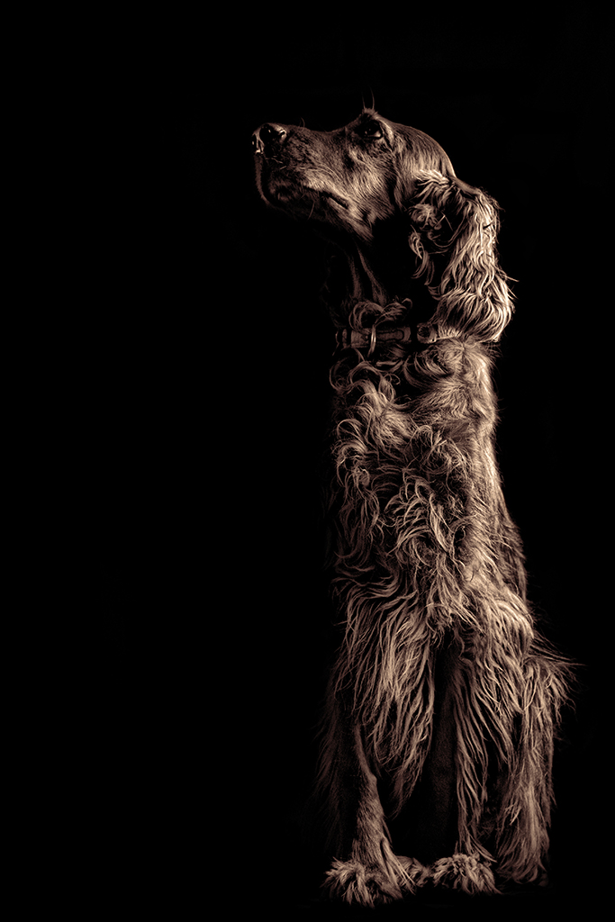 Ci vuole qualche secondo prima di capire che stiamo osservando un bel cane. Questo perché c'è troppo nero che avvolge l'animale, nascondendo le parti caratterizzanti come il naso e gli occhi. Visto il backstage io avrei lasciato vedere un po' dell'ambiente casalingo ed avrei messo la luce sulla sinistra del fotografo, in modo da creare un riflesso (catchlight) sugli occhi.