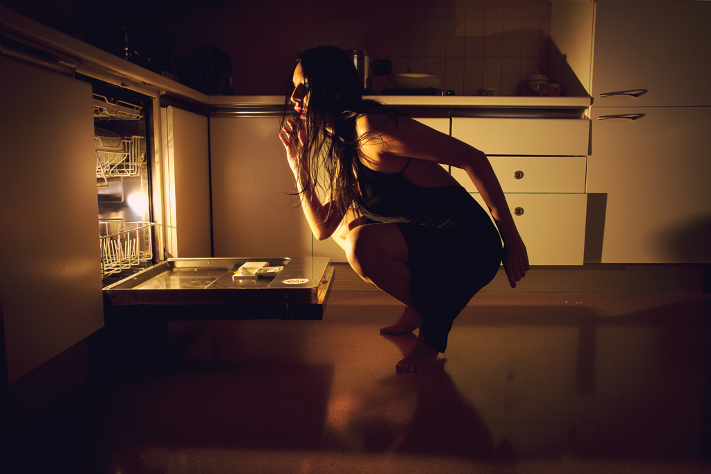 Cosí ho pensato di render tutto assurdo con "casalinga" in abito da sera e la classica luce provenire da.... lavastoviglie.