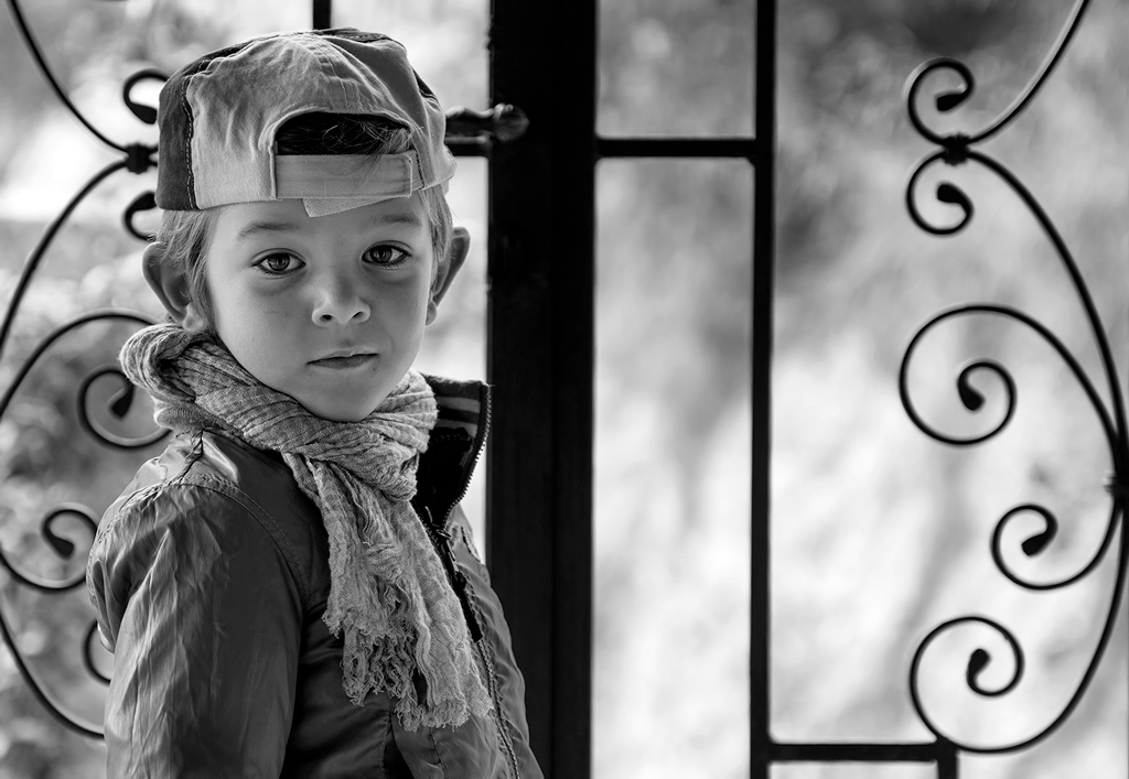 Composizione attenta e sapiente, quella che sbilancia la figura del piccolo di lato ...sul primo generoso terzo a sinistra, e tenta di inquadrarlo all'interno della complicata geometria del decoro in ferro battuto del portone. Decorazione che qui non è soltanto sfondo accidentale, ma è un motivo che figurativamente entra a far parte del quadro di insieme dello scatto e come tale andava gestito e calibrato con certosina cura.