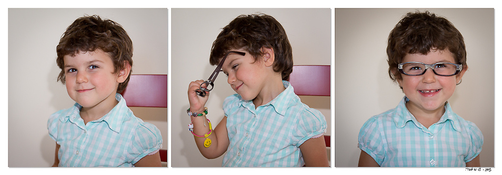 Al di là del problema sedia direi che il trittico si basa fondamentalmente sulle espressioni della bimba e sulla sua felicità/curiosità nel provare gli occhiali