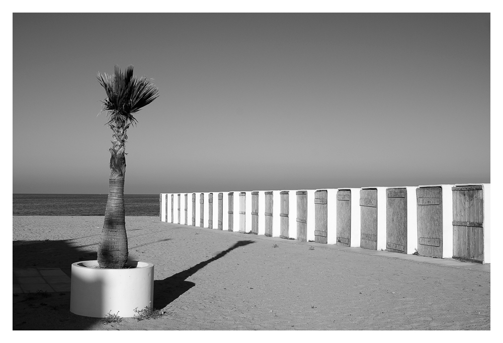 Quasi metafisica. Mi piace molto e mi piace pensare il palmizio qual gnomone di una grande meridiana dove l'ombra segna le ore sulle cabine chiuse.