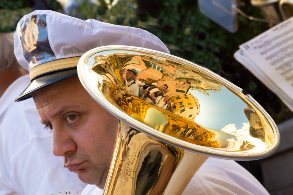 Immagine simpatica "street", dove i veri protagonisti sono i turisti riflessi nella campana di ottone del basso tuba.