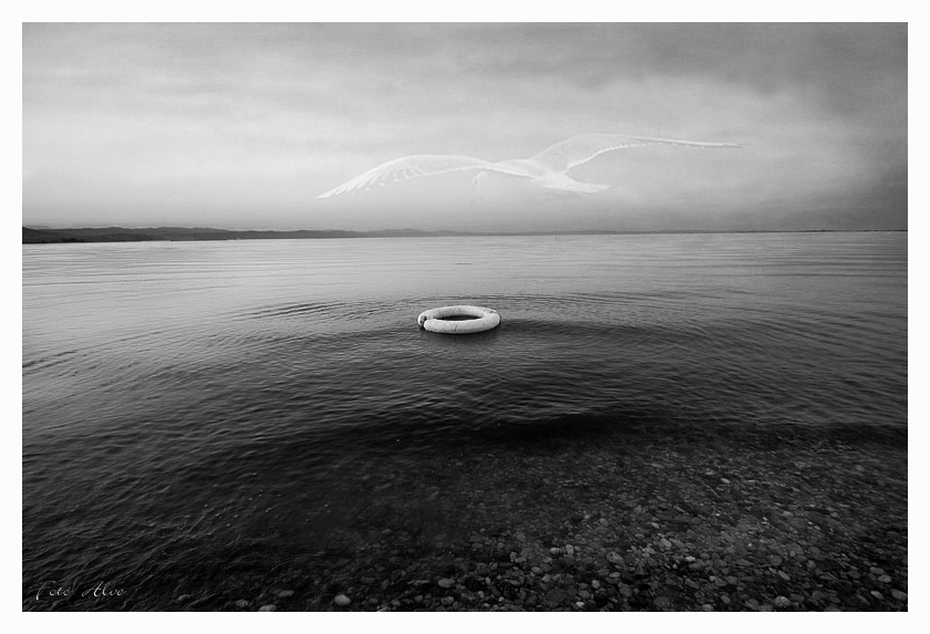 Per me l'effetto fotografico ottiene il suo scopo, quello di emozionare colpendo la coscienza, poca importanza ha, a mio avviso se l'orizzonte è leggermente storto la scena (gabbiano semitrasparente compreso) è ben congegnata e il messaggio arriva.