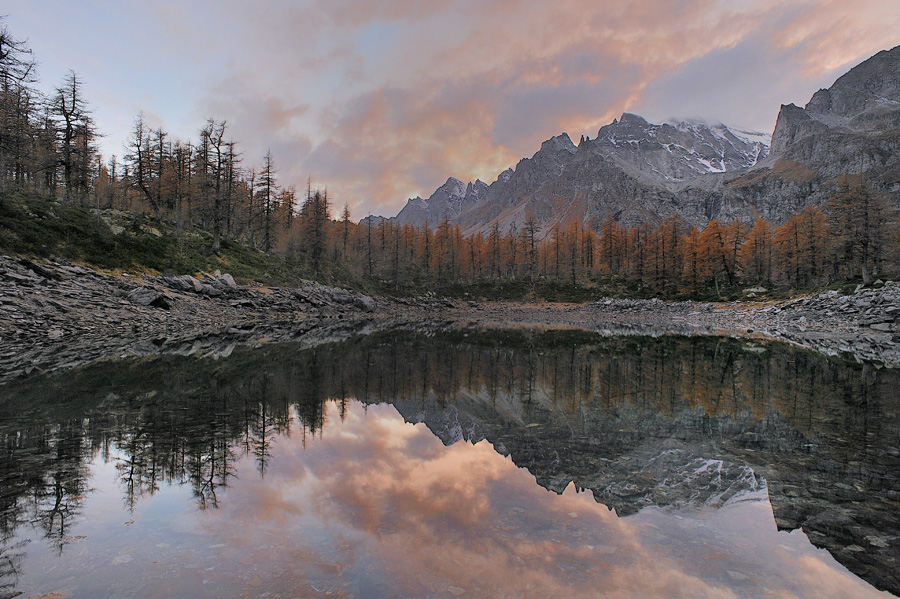 Comunque preferisco l'altra con il lago ripreso per intero e con la luce sui larici. Le condizioni di quel tramonto, anche se, alla fine, si sono colorate un poco le nuvole, non erano un granché.