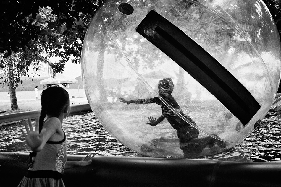 L'immagine sarebbe già stata abbastanza curiosa con il solo bimbo nella palla, ma la coppia di mani sono un valore aggiunto non indifferente.