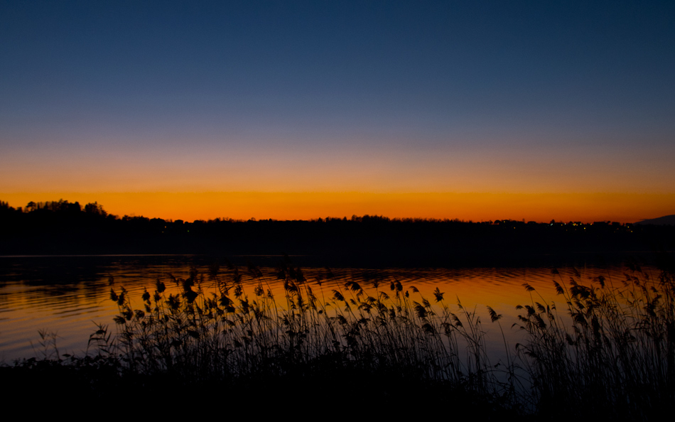 Bello effetto, però se ti fossi alzato, o cercato un'altra posizione, in modo da non far arrivare la vegetazione a contatto con il riflesso dell'altra sponda l'economia della foto ne avrebbe guadagnato, così è un po "confusa".