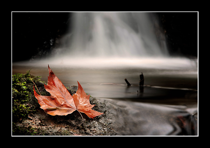 Veramente bellissima la staticità della foglia molto ben contrastata e nitida che si fonde con il movimento "congelato" dell'acqua. Composizione eccellente