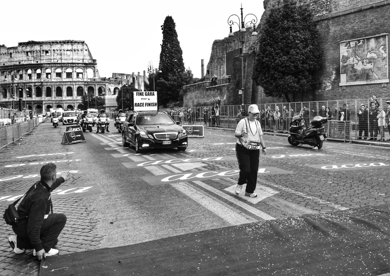 Deve aver sofferto l'appesantita podista per raggiungere il traguardo.