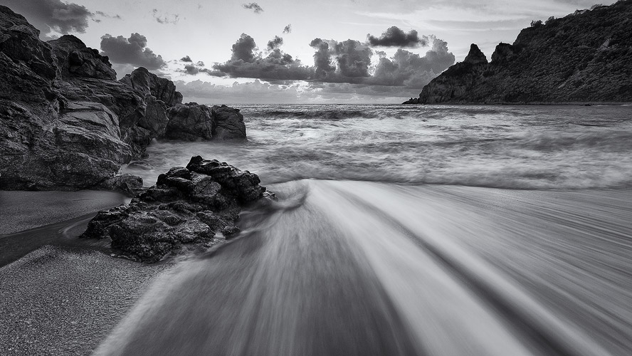 Ho bilanciato la punta del Capo in alto a destra con la roccia in primo piano nel quarto a sinistra. Le linee dello strascico dell'onda, invitano l'occhio ad entrare nella scena.