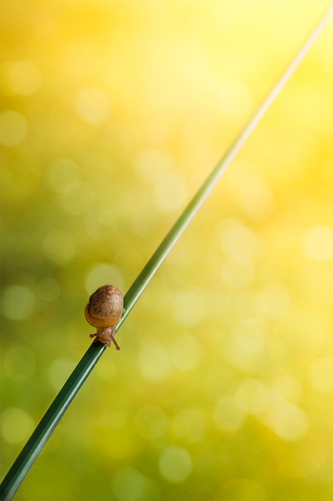 Ciao, deduco dall'abbondante spazio lasciato sopra che tale composizione è sicuramente voluta..., personalmente lo trovo eccessivo, ma questo non vuol dire che non sia piacevole...diciamo che la chiocciolina resta un poco marginale nonostante sia l'attore principale. Ottima la messa a fuoco sugli occhietti...peccato non apprezzarne il dettaglio in una versione HD... Bello lo sfondo..., a proposito del diaframma: f8 ti regala sicuramente uno sfocato molto appagante, ma sono certo che f14 +/- avrebbe reso nitido e leggibile anche il guscio...