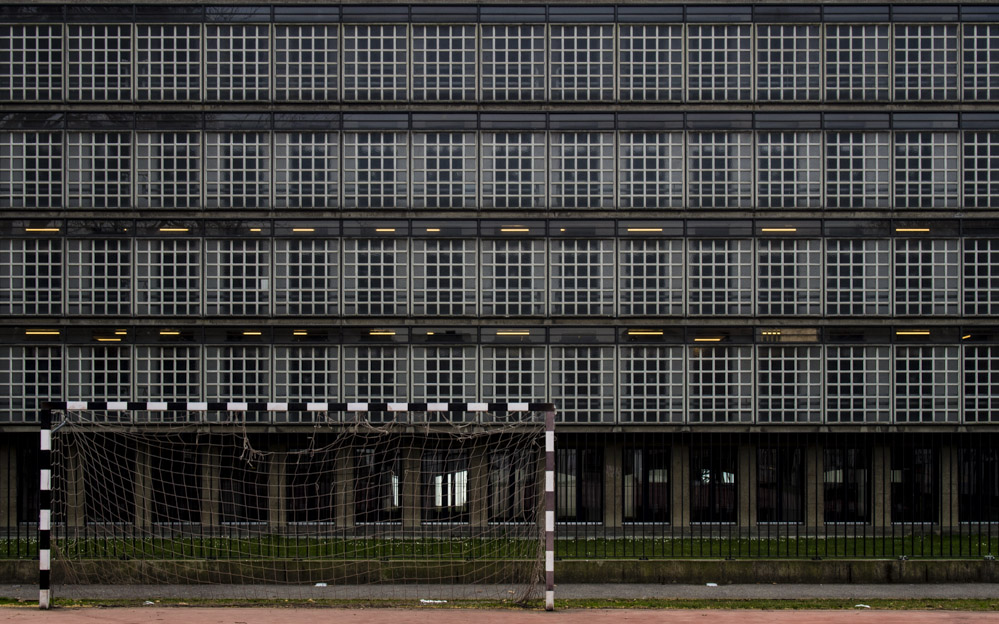 devo dire che l'idea a me piace molto , quella di accostare ad un edificio che ha una certa ripetibiltà nella sua struttura , un elemento discordante come in questo caso la porta di calcio , denota occhio ed attenzione ....