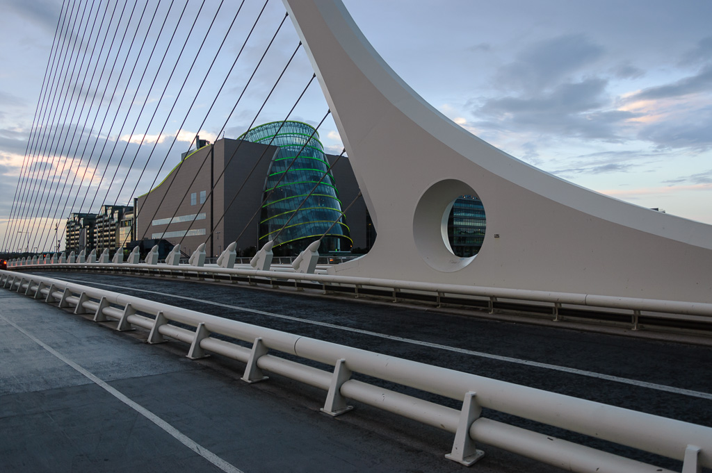 Componendo mi sono concentrato sulla geometria tra la vetrata inclinata e la "bocca" del ponte (che in realtà rappresenta un'arpa) e sull'inclusione nel fotogramma di tutte le corde, trascurando un po' il lato inferiore e quello destro.