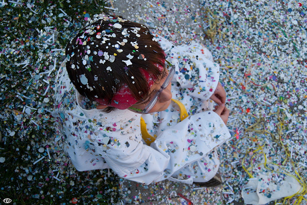 anche a me il soggetto sembra più vittima che parte attiva della festa, la grande quantità di coriandoli n cui si ritrova immerso, mi fanno pensare che sia stato il "bersaglio" della goliardia altrui |