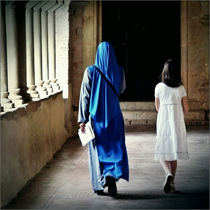 Bello l’azzurro dell’abito della suora, che ne enfatizza il portamento.