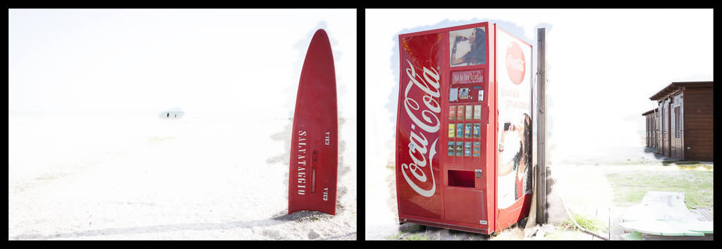 Evidenti il rimando cromatico (innanzitutto), l'impianto compositivo affine e la lavorazione in post tutti tesi ad omogeneizzare e far dialogare le due porzioni del dittico. La Coca-Cola sarebbe contenta dell'analogia tra un loro distributore ed una palina del salvataggio, come fossero oasi in questi "deserti" che dipingi.
