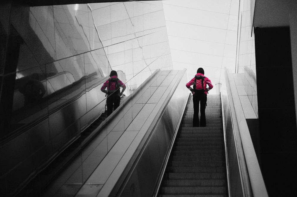 Secondo me la foto acquisterebbe più valore presentata interamente a colori, senza il passaggio in desaturazione parziale. Non lo dico solo perché questa particolare procedura di postproduzione mi dà un enorme senso di artificiosità considerando il fatto che siamo in un ambito street, e la mia concezione di realtà è o completamente a colori o in b/N, senza combinazioni intermedie. Trovo che sia inutile, perchè la figura umana già si inserisce in un contesto estremamente pulito e grafico e non faticherebbe a risaltare; inoltre sei andato ad annientare il riflesso a sinistra, la cui rivelazione invece aggiunge forza al contenuto della foto.