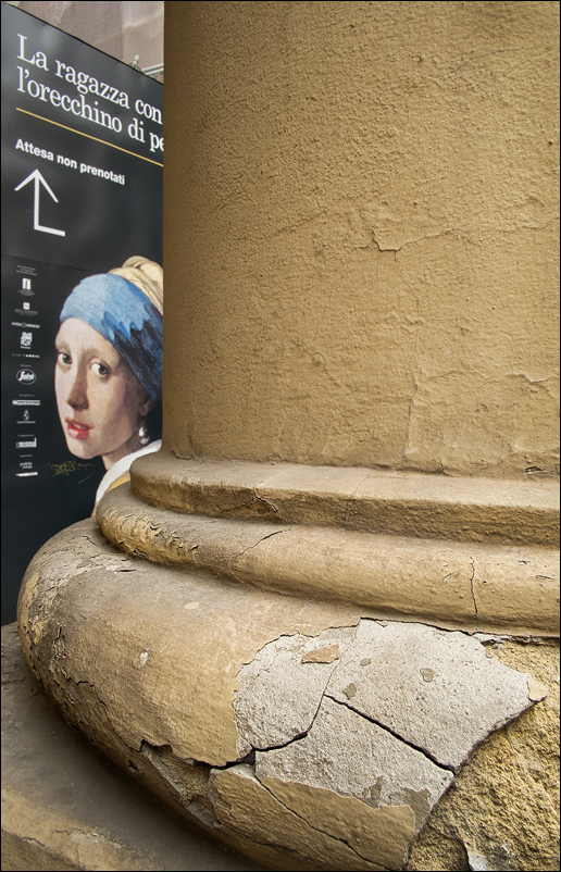 L'occhio sapiente dell'autore ha saputo comporre la foto puntando sullo sguardo della ragazza del quadro che incrocia il particolare della colonna; più che sbirciare sembra avere un occhio compassionevole verso il degrado in corso...