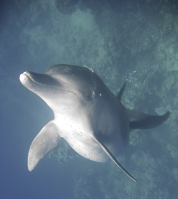 La foto è stata scattata in apnea, mentre scendevo, il delfino ha pensato bene di tornare a respirare e ci siamo incrociati a metà strada... ne ho anche altre (tante insieme a pinne e polpacci di altri bagnanti ), ma questa è quella che preferisco, proprio per il pdr spettacolare.