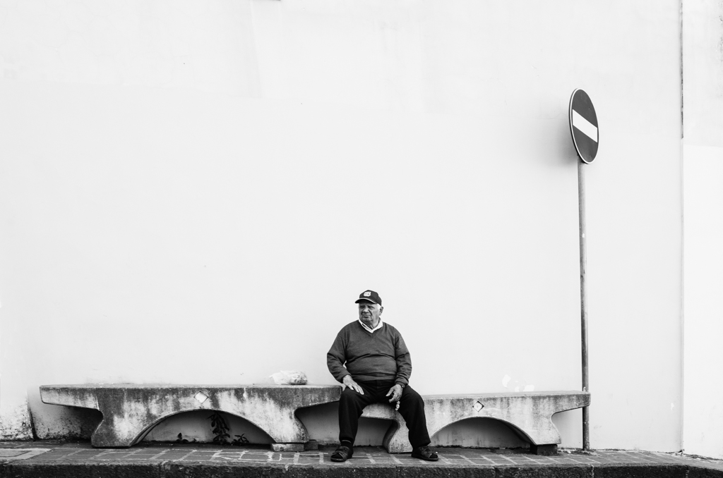 Ritengo che tu abbia reso il muro tutto bianco per evidenziare i due elementi per te importanti, quali il cartello di divieto ed il signore seduto.