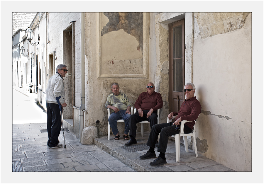 location molto bella e ben rappresentata con attenzione anche alle linee e alla prospettiva,anche se la luce sul fondo andava abbassata, e bello il momento del signore con la stampella che cerca relazione,non mi piacciono invece gli altri 3 che sembrano in posa x la foto.
