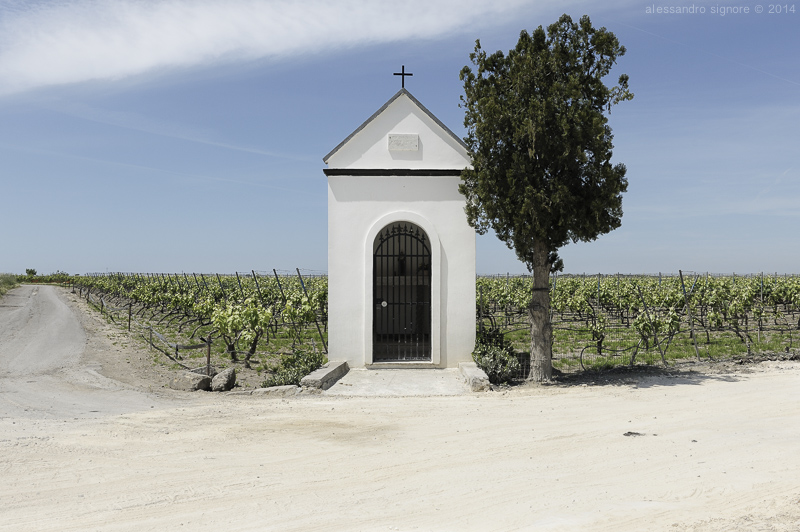 La foto è stata scattata in una zona del Salento dove la produzione di uva è tra le attività agricole predominanti. Mi ha colpito questa vigna che si estende all'infinito, protetta da questa piccola cappella, recentemente ristrutturata.