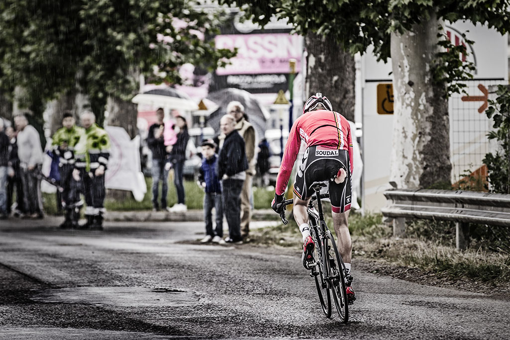 Azz! Non deve essere stata una corsa piacevole per lo sfortunato ciclista, che pure non desiste. Direi che il trattamento un po' grunge, che in genere mi lascia perplesso, in questo caso ben si sposa col soggetto ripreso.