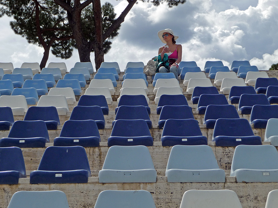 Ci sono molti elementi che mi attirano in questa foto: la signora, le panchine colorate che si ripetono, il punto di ripresa; la presenza della chioma degli alberi, se, da una parte, riporta, in qualche modo, alla morbida volumetria delle nuvole, dall'altra in effetti è un elemento un po' dissonante, eventualmente da sfruttare in maniera un po' diversa.