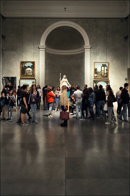 Dal punto di vista delle tonalità di colore ( e lo credo io... abbiamo la stessa macchinetta LOL ) ma, soprattutto, attirano la mia attenzione quel ripetersi di archi nella struttura vera e propria dello stanzone e nei quadri ai lati che ,sulle pareti grigie, emergono in modo veramente prepotente. A mio gusto, mi piacerebbe vedere, anche se impossibile, la medesima foto senza gente davanti. Se riprendi con la giusta maestria le opere d'arte (come hai fatto), il risultato non potrà essere che piacevole.